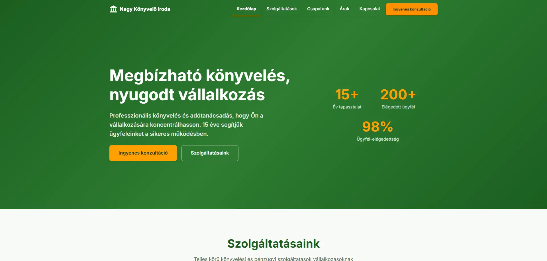 Professzionális, letisztult bemutatkozó oldal könyvelőknek és tanácsadóknak — szolgáltatások, csapat és árak egy helyen.